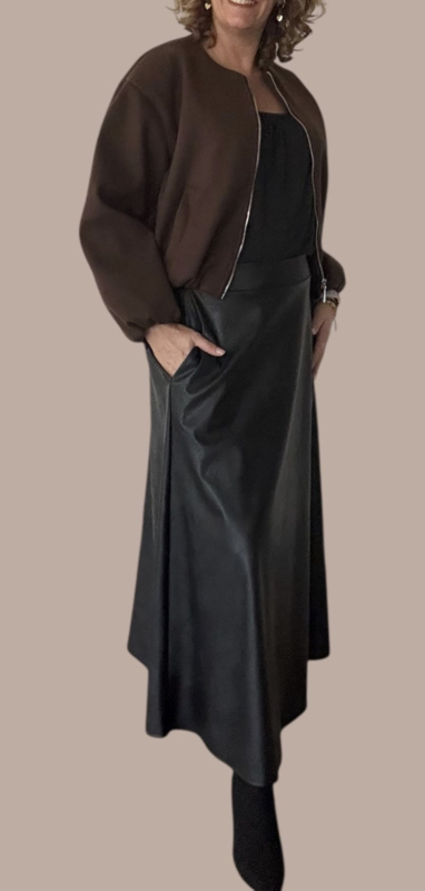 Een leather look rok met een tailleband en elastische achterzijde. Het is een lange rok A-model met goede pasvorm en steekzakken.