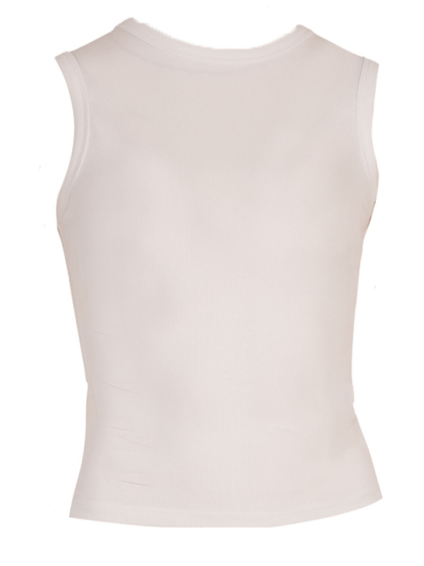 De basic rib motief top van Azzurro mode. Deze top is een mooie pasvorm en heeft een naad op de rug.